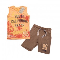 Finom kötésű, puha tapintású kerek nyakú fiú nyomott mintás ujjatlan pamut póló és hozzá tartozó pamut rövid nadrág. Kellemes viselet a nyári melegben.